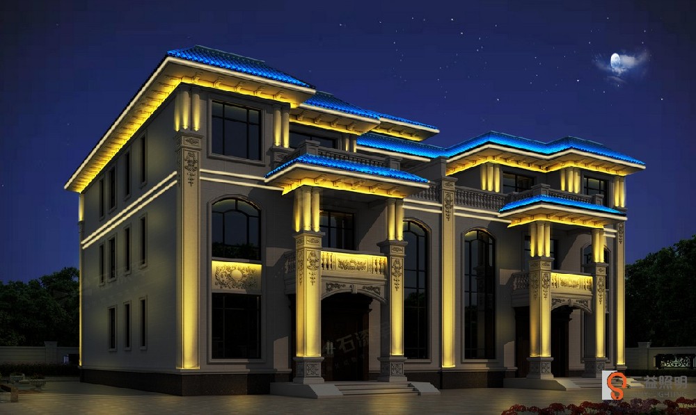湖南益陽市滄水鋪碧云峰胡總別墅設(shè)計方案,采用洗墻燈,線條燈,瓦楞燈,投光燈等,營造出鄉(xiāng)村別墅夜景燈光效果。